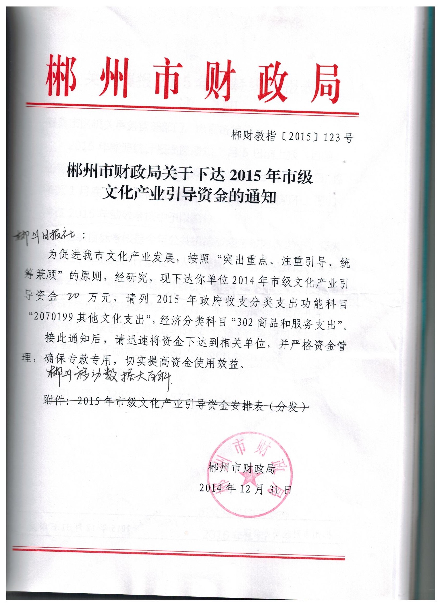 附件:郴州市財(cái)政局關(guān)于下達(dá)2015年市級(jí)文化產(chǎn)業(yè)引導(dǎo)資金的通知 郴財(cái)教指(2015)123號(hào)