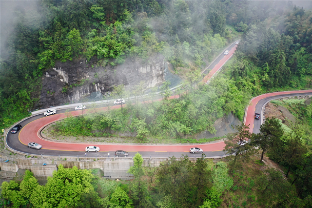 4月18日,來自郴州市的百余臺自駕游車隊在張家界市武陵源景區(qū)彩色公路上行駛。如今,全省已吹響旅游復蘇的號角。