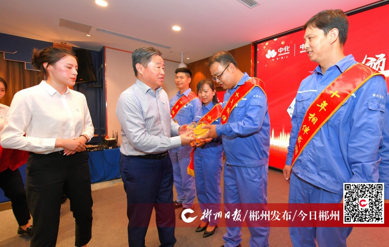 在中化藍天郴州基地成立十周年的儀式上,播放了中化藍天郴州基地《感恩同行》宣傳片,并為中化藍天郴州基地司齡十周年員工代表頒獎。