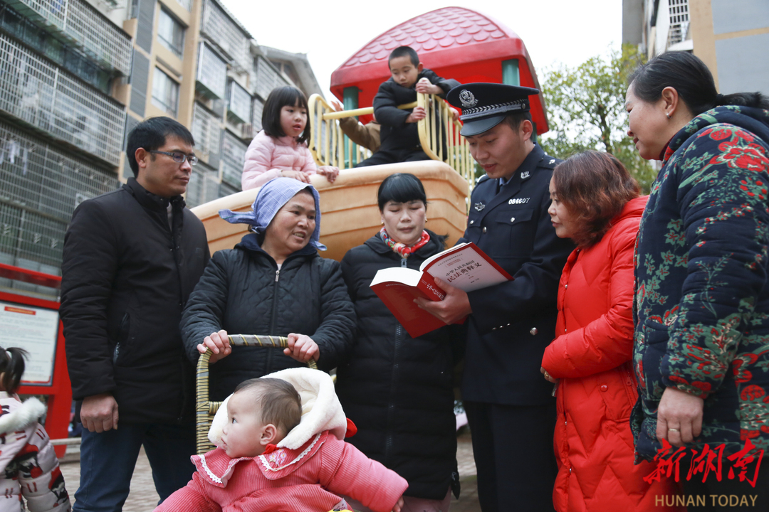 2021年12月30日,通道侗族自治縣雙江鎮(zhèn)金水岸小區(qū),縣公安局法制民警為居民講解《民法典》。 彭萬(wàn)磊 攝