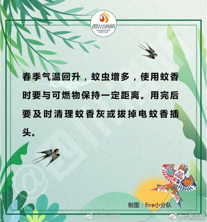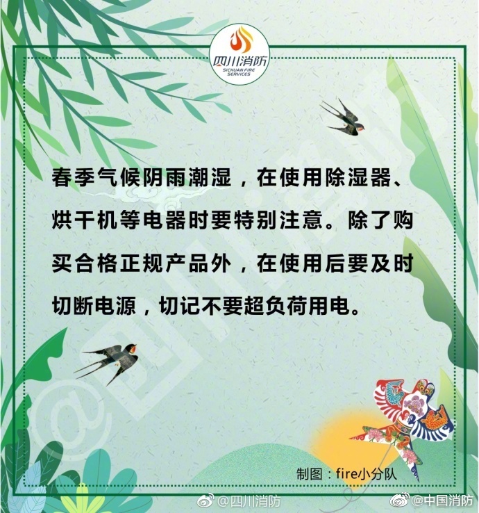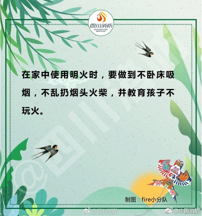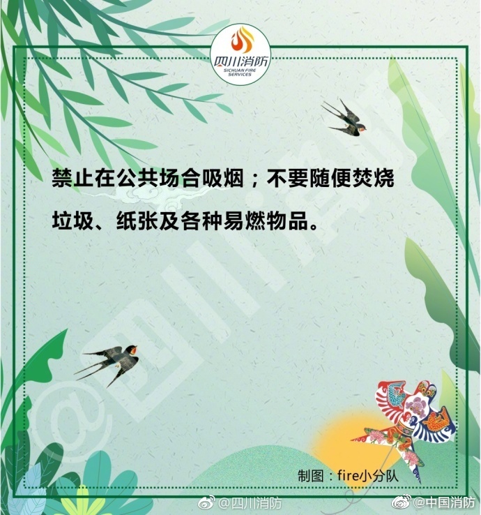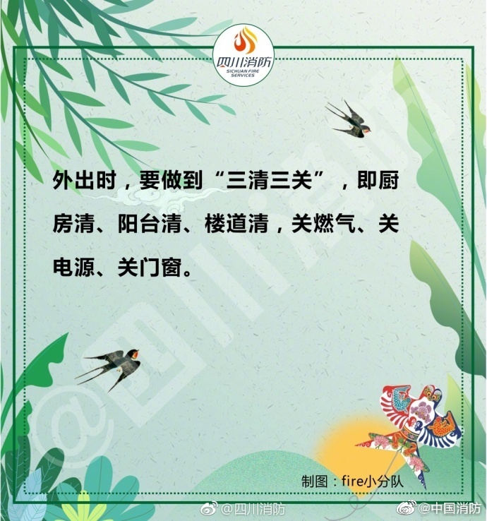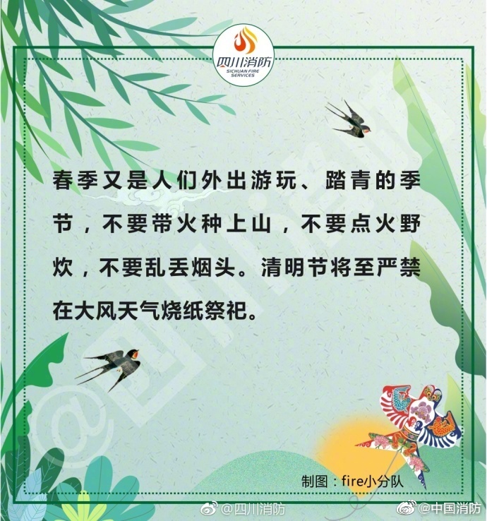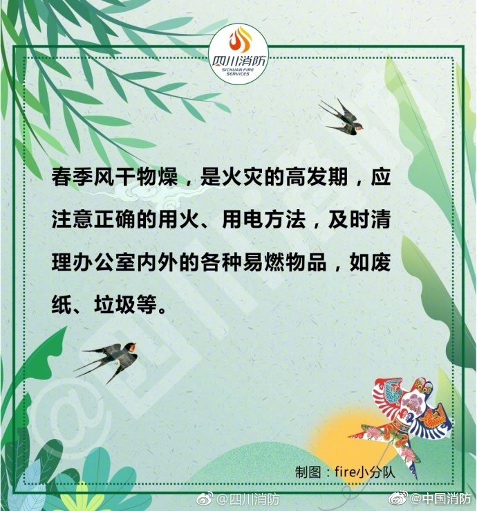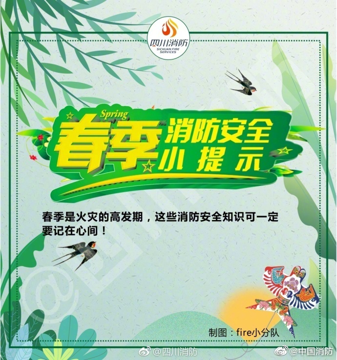 春季天干物燥,是火災(zāi)的高發(fā)期,稍有不慎,就可能發(fā)生火災(zāi)事故。外出記得關(guān)閉電源,郊游要小心迷路,在家不要臥床吸煙……給大家安利一份春季消防安全提示,戳圖了解一下吧~