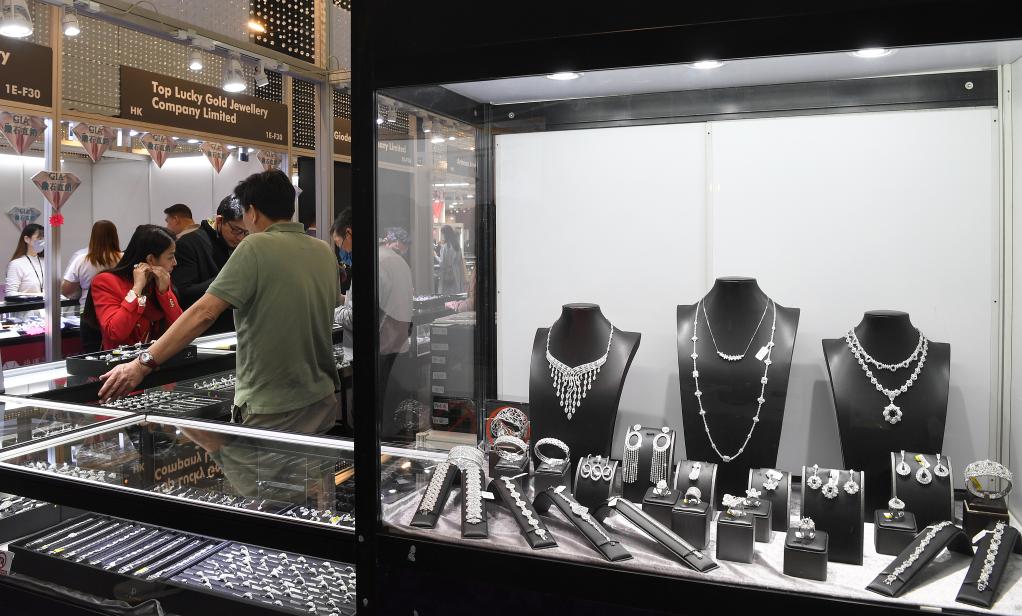 3月1日,參觀者在珠寶展上挑選珠寶。新華社記者 陳鐸 攝