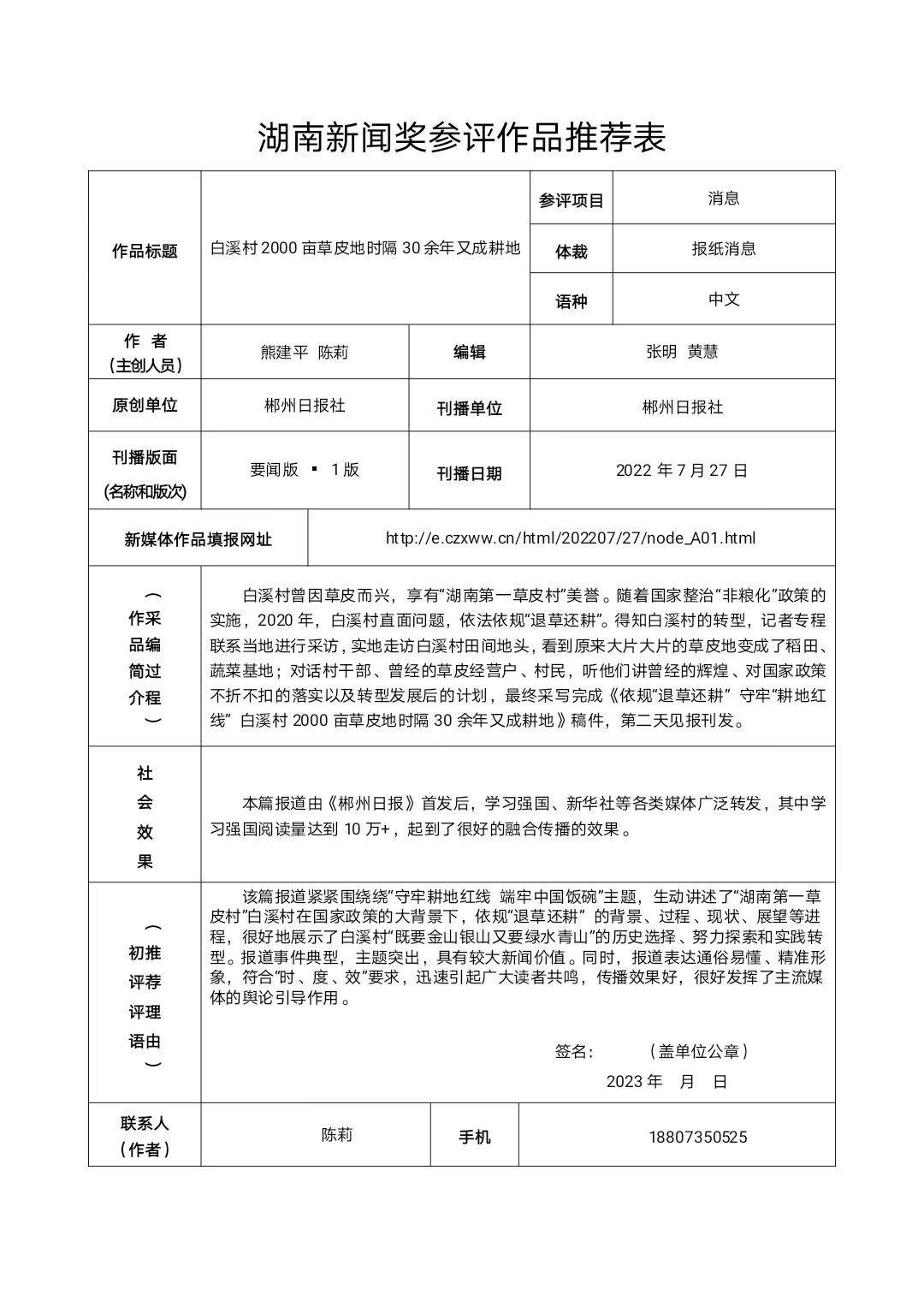 根據(jù)《湖南新聞獎評選辦法》《關(guān)于開展2022年度湖南新聞獎參評作品報送工作的通知》規(guī)定,郴州市新聞工作者協(xié)會組織初評委員會初評決定,擬推薦《田長制助北湖區(qū)三合村“重啟”》等23件作品參加2022年度湖南新聞獎的評選。相關(guān)信息和參評材料公示如下。