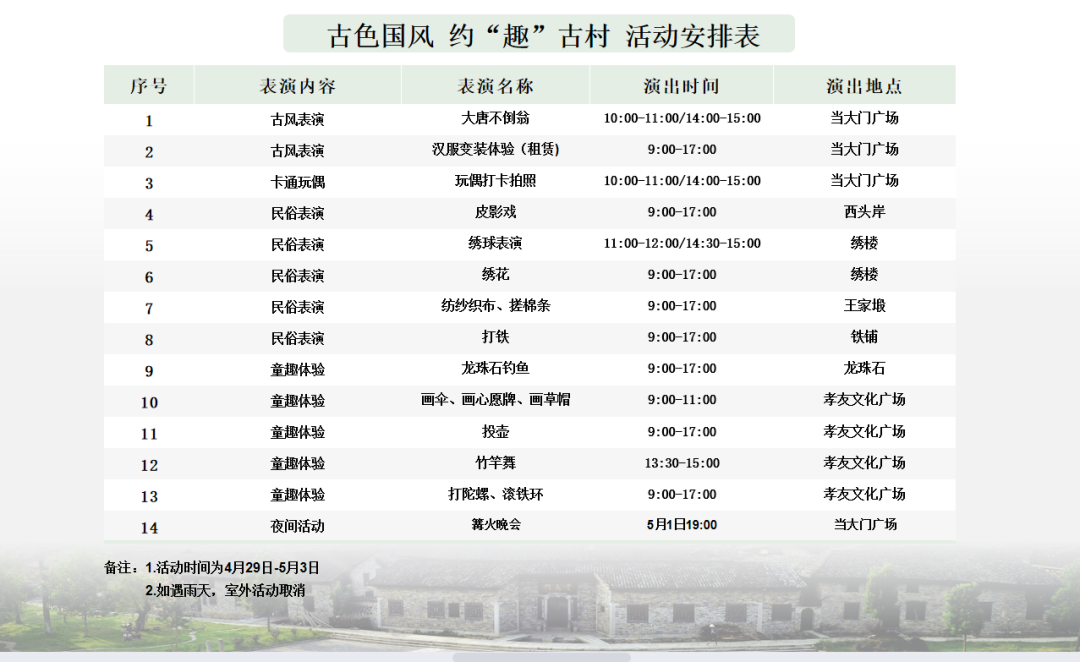 4月29日至5月3日,張谷英旅游景區(qū)將舉辦一系列特色活動(dòng),包括:大唐不倒翁、漢服變裝體驗(yàn)等古風(fēng)表演;紡紗織布、繡花、打鐵等特色民俗表演;畫傘、畫草帽、畫心愿牌、投壺、竹竿舞、打陀螺、滾鐵環(huán)等童趣體驗(yàn)。