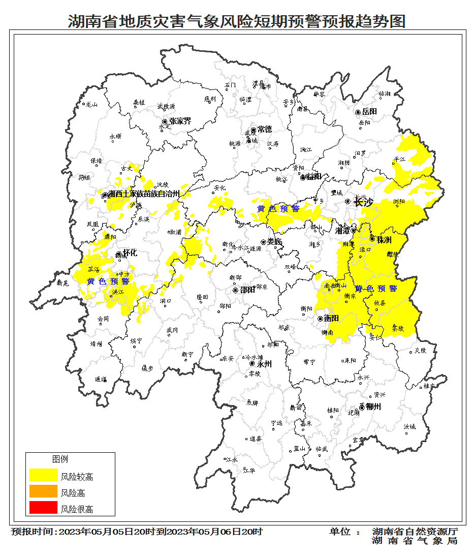 根據(jù)地質(zhì)災(zāi)害成災(zāi)規(guī)律和孕災(zāi)條件,結(jié)合2023年5月5日短期氣象預(yù)報(bào)情況,省自然資源廳與省氣象局聯(lián)合會(huì)商得出如下結(jié)論:自5月5日20:00至6日20:00,受降雨影響,湘中、湘西、 湘東大部分區(qū)域發(fā)生突發(fā)性地質(zhì)災(zāi)害風(fēng)險(xiǎn)較高(黃色預(yù)警)。