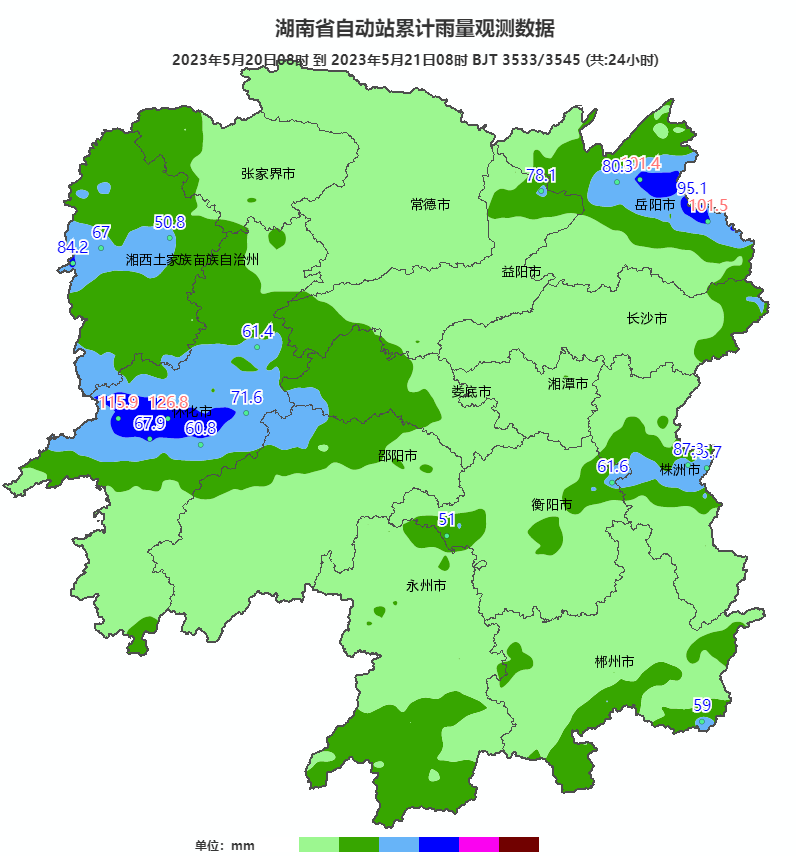 20日08時至21日08時,強(qiáng)降雨主要集中在懷化、湘西州、岳陽、株洲等地,湘西州(保靖、永順、古丈、龍山)、益陽(南縣)、岳陽(臨湘、平江、岳陽縣、岳陽樓區(qū))、株洲(攸縣)、邵陽(隆回)、懷化(芷江、中方、鶴城區(qū)、辰溪、麻陽、洪江、溆浦)、郴州(汝城)、衡陽(祁東、衡東)共21個市縣區(qū)125站累計(jì)雨量超過50毫米,其中岳陽(平江、臨湘)、懷化(鶴城區(qū)、芷江、中方)5個市縣區(qū)10站超過100毫米,最大累計(jì)雨量為鶴城區(qū)工務(wù)段站126.8毫米(圖1),最大小時雨強(qiáng)為保靖碗米坡站55.8毫米(21日06時至07時)。另外,郴州、株洲、永州、衡陽等地出現(xiàn)8級以上大風(fēng),最大為郴州蘇仙區(qū)高峰水庫25.1米/秒(10級,20日22時)。