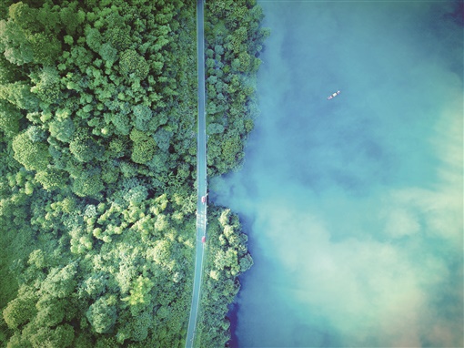 過了大壩便是碼頭,陸路改為水路。乘船而往,一池天藍(lán)色的湖水在游輪的長笛聲中緩緩散開,目力所及,湖面如一塊巨大的翡翠,平靜得不可思議。如果不是天上朵朵白云跌落下來,化成輪船下的片片浪花,這鏡面般的湖,怕是一點(diǎn)兒漣漪都會(huì)沒有——立于船頭,憑欄遠(yuǎn)望,湖面萬里,江天一色,滿眼都是亦真亦幻的丹青畫卷,處處都有絲絲縷縷的遠(yuǎn)山長,云山亂,曉山青。游人扣舷而歌,悠長的天籟之音便會(huì)在波光粼粼的水面一路東去,余音裊裊之上,一定有湖心的云霞飛鳥,一定有湖面的漁舟唱晚,更一定有星羅棋布在湖水中的綠島叢林。
