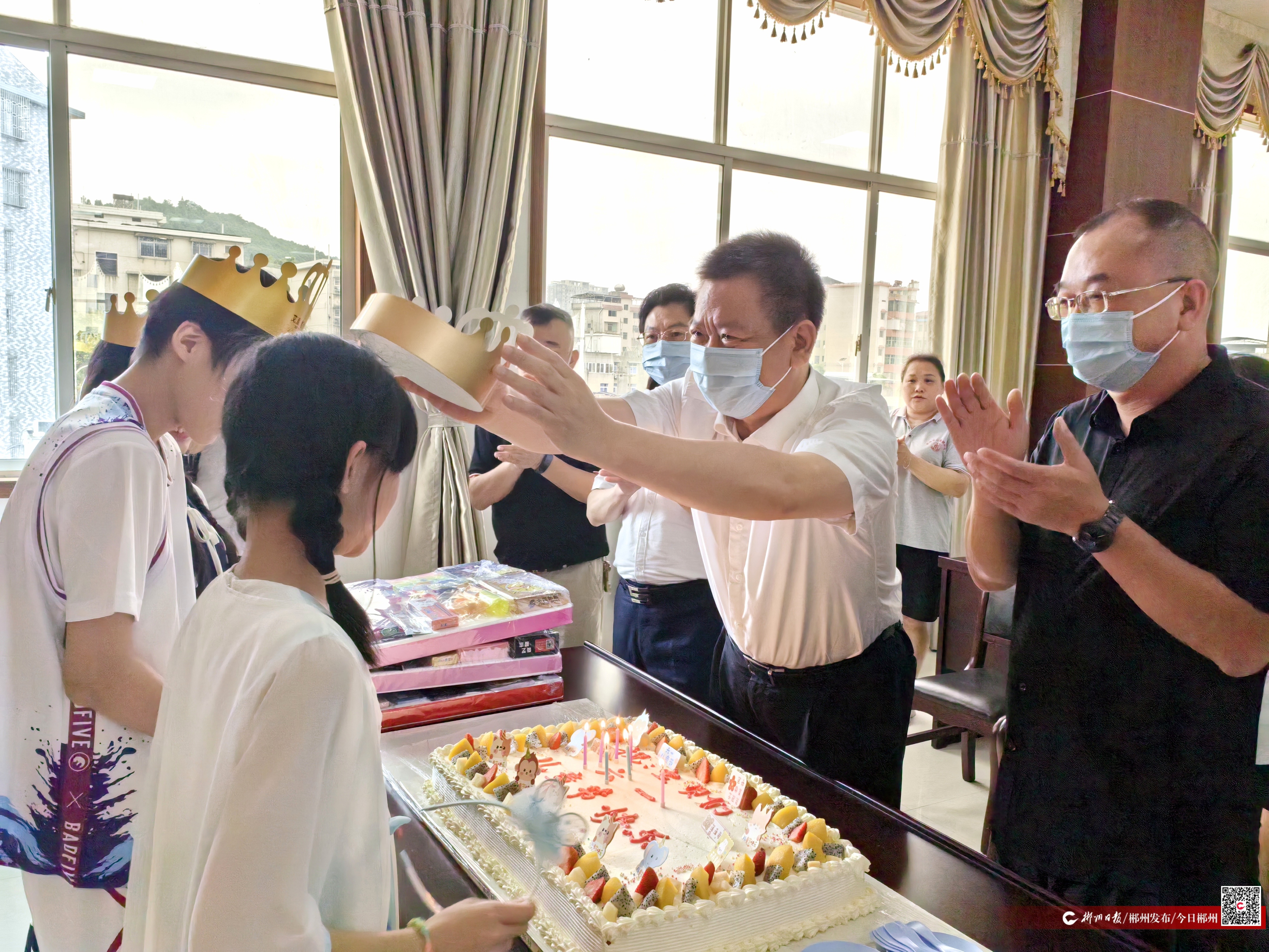 在市兒童福利院,彭生智觀看了孩子們的演出,為他們送上慰問金,并為福利院的三名小朋友過生日。
