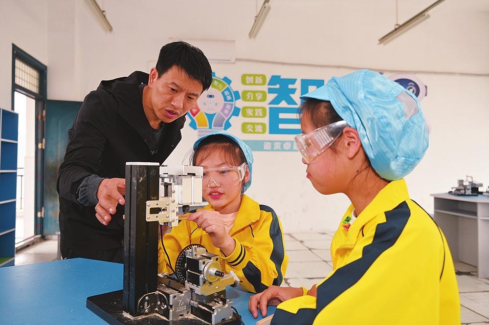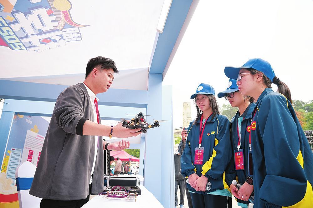 ▲在宜章縣湘南紅軍學(xué)校,科技專家開展了航模、3D打印、STEAM創(chuàng)客教育等實(shí)操培訓(xùn),圖為學(xué)生在體驗(yàn)操作無人機(jī)。