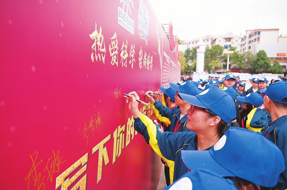▲參加科普主題展的學(xué)生爭相寫下自己的科學(xué)夢想。