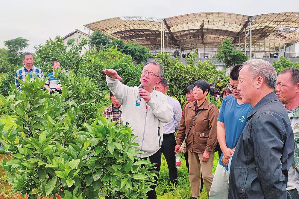 ▲湖南農(nóng)業(yè)大學(xué)教授為果農(nóng)講解品種遴選、果園規(guī)劃與建設(shè)、種植管理及科學(xué)灌溉施肥、病蟲害防治等知識。
