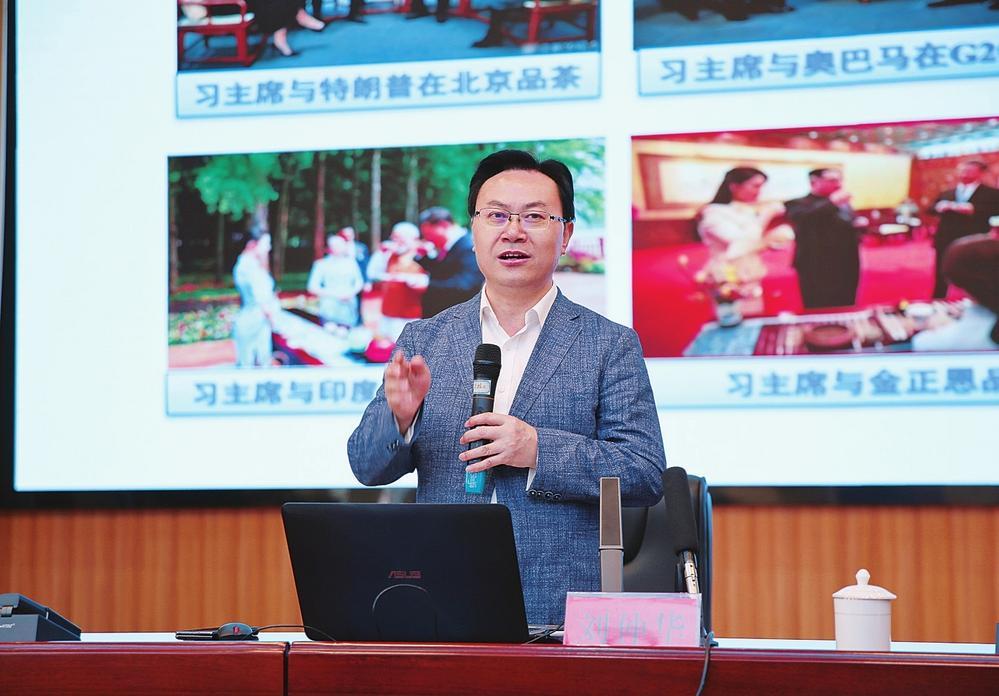 ▲院士講壇上,中央候補(bǔ)委員、中國工程院院士、湖南農(nóng)業(yè)大學(xué)教授劉仲華圍繞“科技賦能茶葉產(chǎn)業(yè)發(fā)展”主題授課。