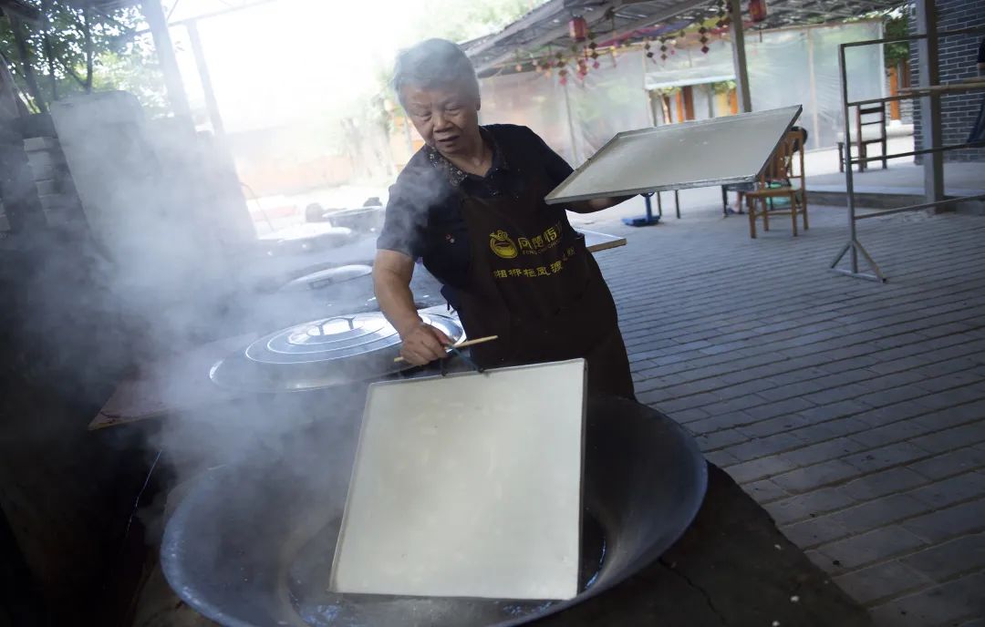 南香村是魚粉老基地所在地,保持著最傳統(tǒng)的手工切粉工藝,幾乎家家戶戶都做米粉。我們到南香村時(shí),趕上幾家農(nóng)戶正在做米粉,家里的婦人往往是蒸粉的主力,戴著遮陽帽,在炙熱陽光下、爐火旁動(dòng)作嫻熟地蒸粉,丈夫在一旁幫忙晾曬,婦唱夫隨的勞動(dòng)場(chǎng)景,很容易讓人生出感動(dòng)來。