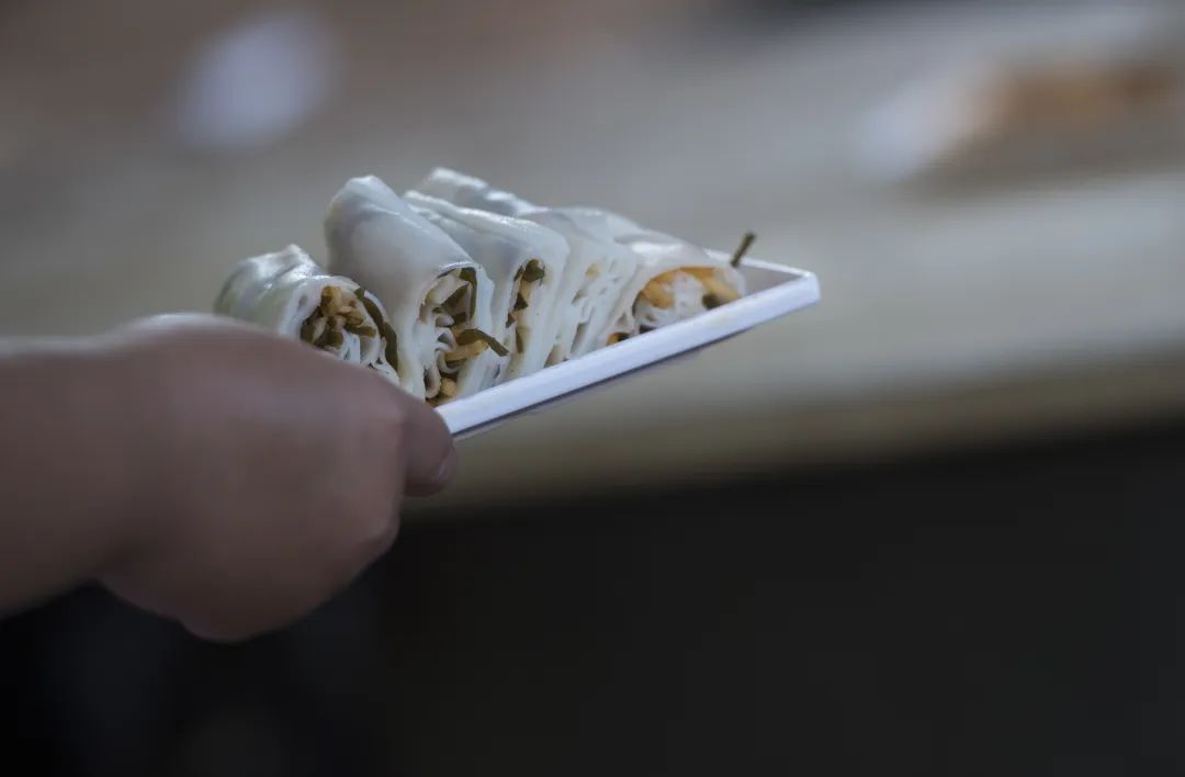 與長(zhǎng)沙米粉不同,磨好的米漿,會(huì)加入幾滴茶油,讓米粉變得有韌勁。等米漿準(zhǔn)備就緒,柴火已經(jīng)燒得很旺,大鐵鍋里的水沸騰起來,吳安英將米漿在粉盤里均勻攤開,就放入鍋內(nèi)蒸?!耙贿M(jìn)一出”是吳安英總結(jié)出來的經(jīng)驗(yàn),下一個(gè)粉盤準(zhǔn)備就緒,鍋里的米粉剛好蒸熟,“沒蒸熟容易斷,太熟了不容易扒下來”。迫不及待的食客們等在爐灶旁,蒸熟的粉皮包裹上酸菜青菜,是一道美味,“像廣東腸粉一樣”,滿口米香。