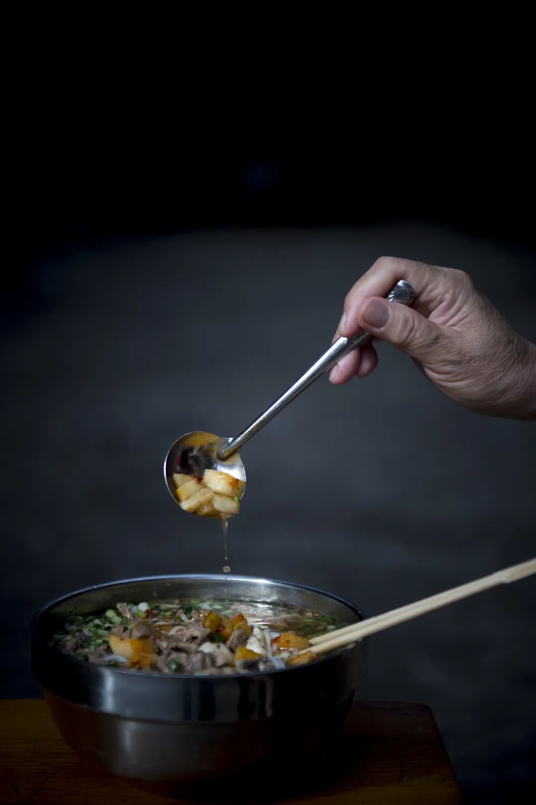李春平的粉店就在老糧店門口,“白露塘糧店殺豬粉”的招牌剛掛不久,鎮(zhèn)上還有其他的殺豬粉店,無論老板如何招攬,客人多半直奔李春平的店子。我們正趕上客流高峰期,李春平夫婦在廚房里忙碌。開水里燙過的粉放了一整桌,只等客人點(diǎn)單,加入湯汁和澆頭即可,澆頭只有殺豬肉,殺豬肉用前一天晚上熬好的高湯現(xiàn)煮,幾分鐘即可。20多年里,夫妻倆每天做粉十幾個(gè)小時(shí),配合默契,像一條流暢的生產(chǎn)線,客人再多,也不至于忙亂。