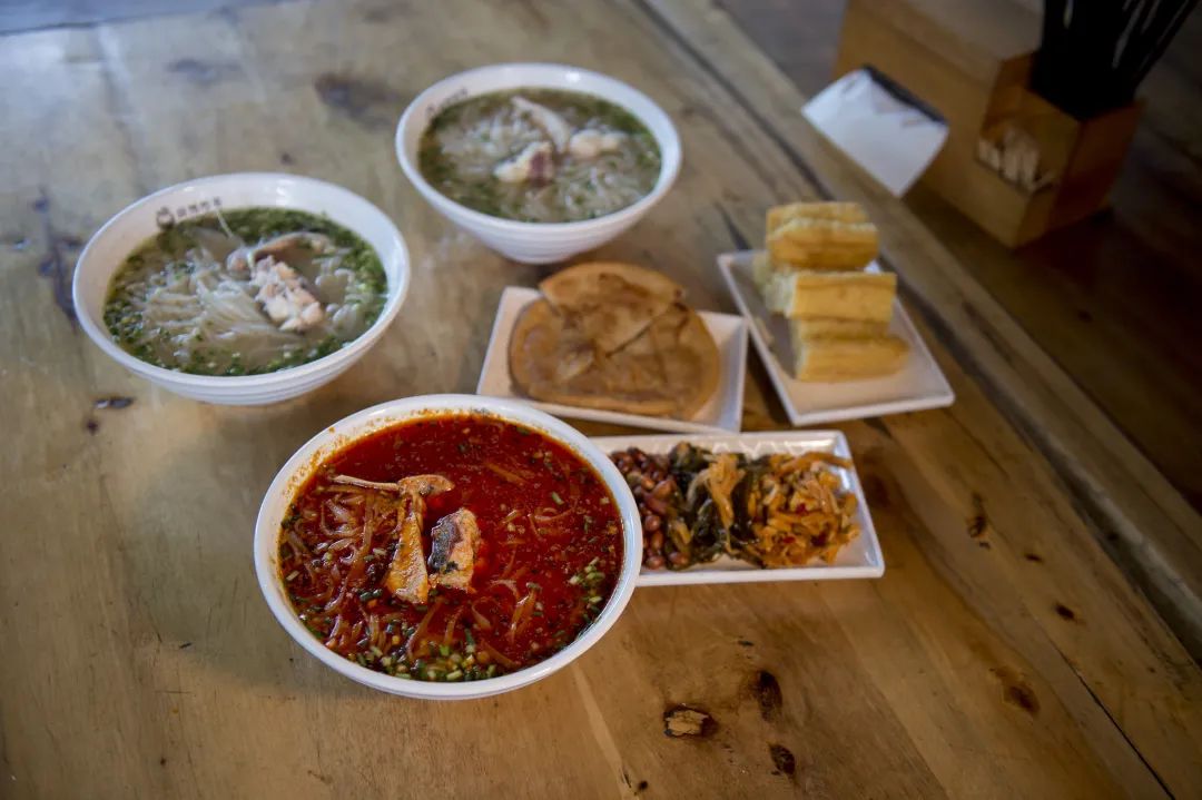 “之前多是紅湯,后來外地人多,就開發(fā)了清湯魚粉?!弊叱鲂℃?zhèn),直面廣闊市場(chǎng)的棲鳳渡魚粉,變得豐富多樣。不過,越是遠(yuǎn)道而來的食客,更喜歡點(diǎn)一碗熱烈的紅湯粉,像是對(duì)棲鳳渡魚粉辣度的一次挑戰(zhàn),滿頭大汗、口舌發(fā)麻,才算得上酣暢淋漓。