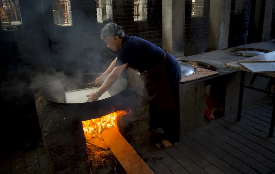 米泡好后,是磨漿,基地里擺放著十幾輪石磨,供游客體驗(yàn)。推磨,是吳安英兒時(shí)每天的必修課,“你看我的手臂,這么粗,就是推磨鍛煉出來的?!眳前灿⑸斐鍪直坌ΑW鲷~粉算得上她的家族事業(yè),吳安英的外祖父在鎮(zhèn)上經(jīng)營(yíng)一個(gè)魚粉攤,母親繼承了外祖父的魚粉攤?!案赣H去世得早,母親就靠一個(gè)魚粉攤養(yǎng)活我們姊妹五人。”吳安英是老大,自然早早承擔(dān)起了家務(wù)和生意,“每天下午都要推磨、做粉。一天多的時(shí)候要磨100斤米”。石磨的吱呀聲,伴隨著她的整個(gè)童年。磨漿是件細(xì)致的活,“要磨得細(xì),一次米不能放太多,不能太快,而且要經(jīng)常清洗、打鑿石磨的槽”。她右手推動(dòng)著磨盤,介紹其中的“玄機(jī)”,竟然顯得優(yōu)雅。1969年,吳安英上山下鄉(xiāng)到棲鳳渡鄉(xiāng)太陽紅公社(現(xiàn)太陽坌村),才從單調(diào)枯燥的推磨中解脫出來,“他們村很少有人做米粉,我就成了師傅,我教他們做米粉,他們推磨”。
