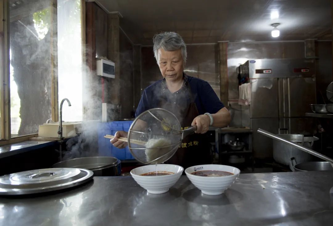 小鎮(zhèn)現(xiàn)在最熱鬧的時(shí)節(jié)是周末,各地的人都開車來小鎮(zhèn),只為吃一碗魚粉,“常常造成交通擁堵”。小鎮(zhèn)在落寞之后,因?yàn)轸~粉而興,這是年過古稀的吳安英沒有想到的。魚粉,于她,曾經(jīng)只是祖輩們和她不得已謀生的活計(jì)。她更不會(huì)想到,她會(huì)成為“棲鳳渡魚粉手工制作技藝”項(xiàng)目傳承人和棲鳳渡魚粉的“形象代言人”。