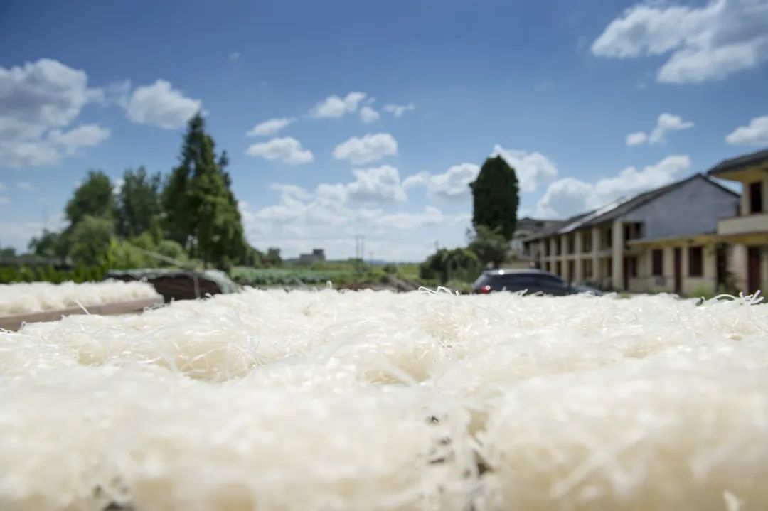 從粉盤上小心翼翼取下的米粉,需要掛在竹竿上晾曬幾個(gè)小時(shí)?!坝檬诌幌拢燮ぱ杆僬归_就算可以了?!绷罆駶穸鹊轿坏姆燮ぃ衅饋聿徽车?。吳安英刀工干凈利落,粉皮很快被切成均勻細(xì)致的粉條。切成條的米粉,盤成鳥窩形狀,放在簸箕里再次晾曬,如果當(dāng)天食用,風(fēng)干幾個(gè)小時(shí)就可以直接下鍋。如果要存儲(chǔ),則需要完全曬干,“有水分,容易發(fā)霉”。