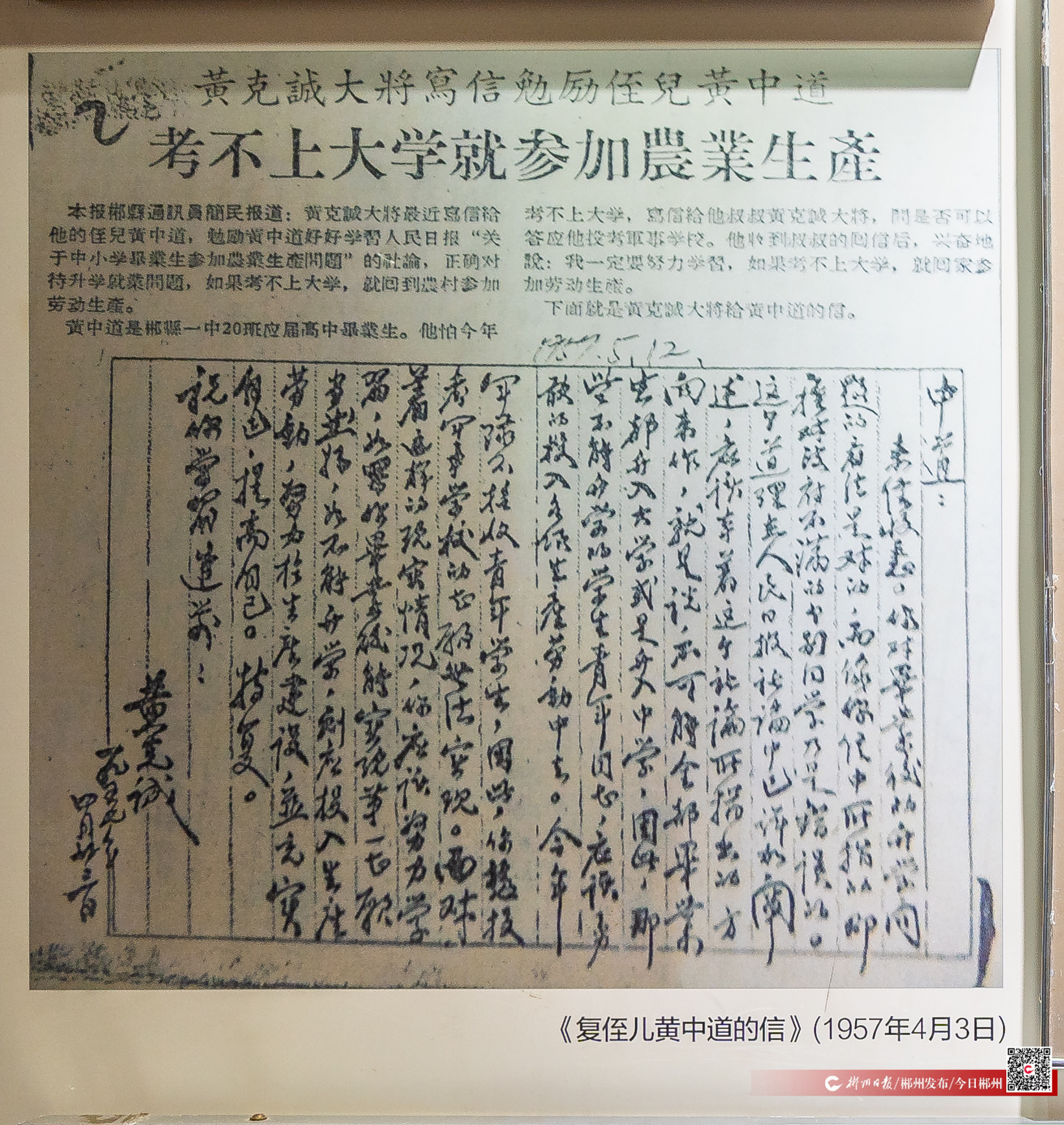踏尋紅色足跡,追憶將軍風(fēng)采。黃克誠故居吸引越來越多的游客前來參觀學(xué)習(xí)。在故居陳列室,一篇在1957年報紙上發(fā)表的報道《黃克誠大將寫信勉勵侄兒黃中道 考不上大學(xué)就參加農(nóng)業(yè)生產(chǎn)》引人關(guān)注。報道稱:黃克誠大將最近寫信給他的侄兒黃中道,勉勵黃中道好好學(xué)習(xí)《人民日報》“關(guān)于中小學(xué)畢業(yè)生參加農(nóng)業(yè)生產(chǎn)問題”的社論,正確對待升學(xué)就業(yè)問題,如果考不上大學(xué),就回到農(nóng)村參加勞動生產(chǎn)。報道介紹,黃中道是郴縣一中20班應(yīng)屆畢業(yè)生。他怕當(dāng)年考不上大學(xué),寫信給他的叔叔黃克誠,問是否可以答應(yīng)他報考軍事學(xué)校。收到叔叔的回信后,黃中道興奮地說:“我一定要努力學(xué)習(xí),如果考不上大學(xué),就回家參加勞動生產(chǎn)?!眻蟮肋€附有黃克誠手寫書信的照片。