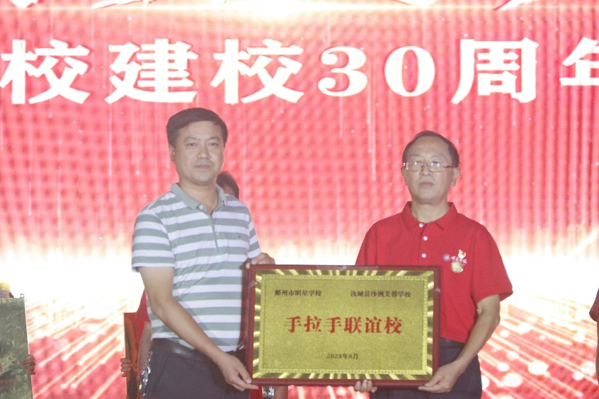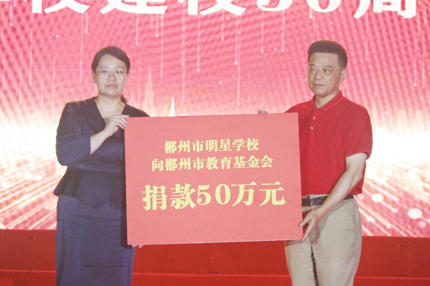 在莊嚴(yán)嘹亮的國(guó)歌聲中,慶典正式拉開(kāi)序幕?;顒?dòng)中,郴州市明星學(xué)校向郴州市教育基金會(huì)捐贈(zèng)50萬(wàn)元作為“明星教育基金”啟動(dòng)基金,并現(xiàn)場(chǎng)舉行與汝城縣沙洲芙蓉學(xué)校手拉手聯(lián)誼揭牌儀式,以實(shí)際行動(dòng)大手拉小手,賡續(xù)紅色基因,培養(yǎng)時(shí)代新人。