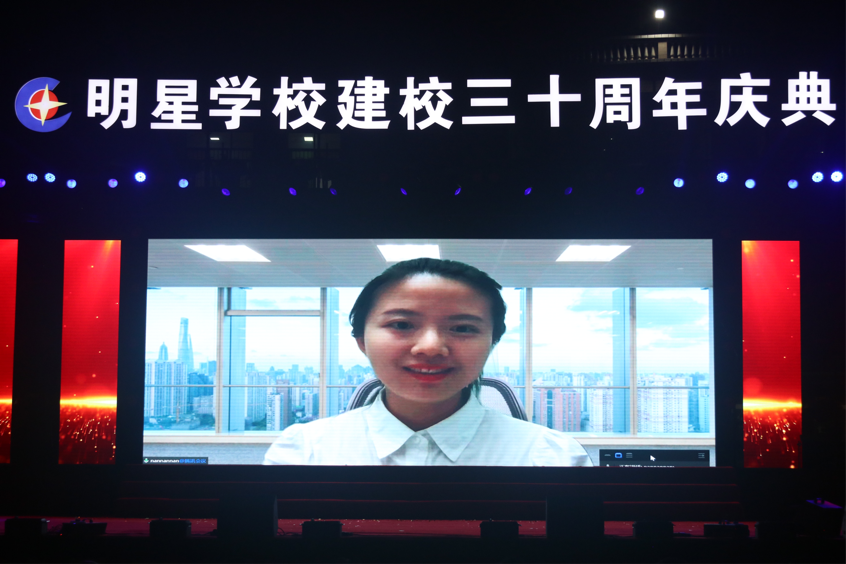 “我要由衷地感謝母校的老師們,正是因?yàn)樗麄兊男燎诟冻龊拖ば慕陶d,我才能夠成為今天的自己,老師們不僅在學(xué)業(yè)上給予我?guī)椭?,更讓我明白了如何做一個(gè)有擔(dān)當(dāng)、有社會(huì)責(zé)任感的人。”郴州市明星學(xué)校優(yōu)秀畢業(yè)生代表江夢(mèng)南通過(guò)大屏幕與學(xué)?,F(xiàn)場(chǎng)連線,為母校送上祝福,希望母校繼續(xù)引領(lǐng)教育潮流,拓展國(guó)際化交流,培養(yǎng)更多具有創(chuàng)新精神的人才。