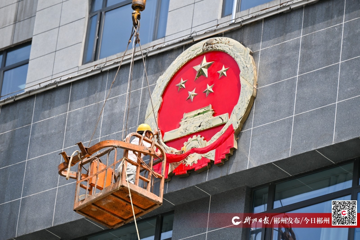 6月30日,蘇仙區(qū)組織專業(yè)人員對(duì)懸掛在區(qū)政府大樓上的國(guó)徽進(jìn)行修復(fù)擦亮,擦亮修復(fù)后的國(guó)徽在陽(yáng)光下熠熠生輝。