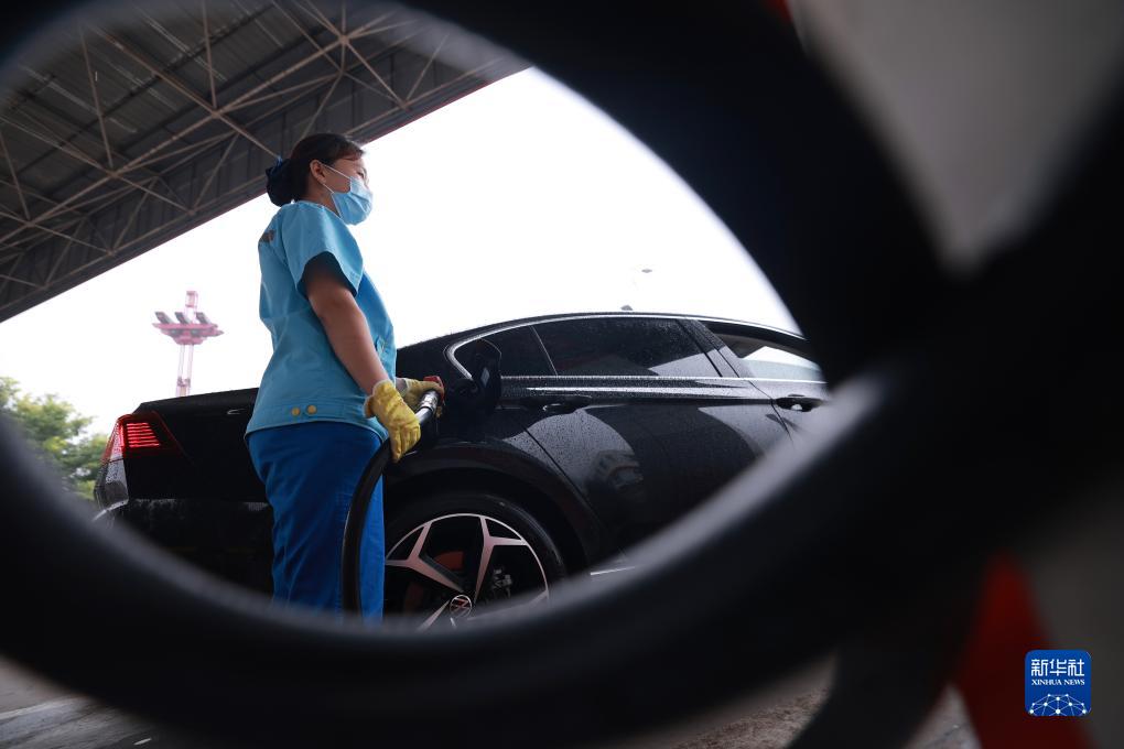 7月12日,河北省內(nèi)丘縣一家加油站的工作人員為汽車加油。新華社記者 朱旭東 攝