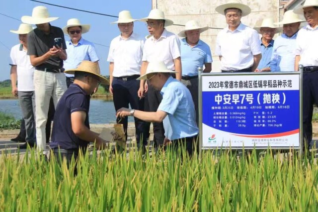 7月12日,農(nóng)業(yè)農(nóng)村部水稻專家指導(dǎo)組觀摩常德市鼎城區(qū)千畝低鎘早稻試驗(yàn)示范基地,并進(jìn)行現(xiàn)場評(píng)議。專家們一致認(rèn)為這兩個(gè)品種豐產(chǎn)性好、低鎘特性顯著,對(duì)解決稻米鎘污染具有開創(chuàng)性意義。
