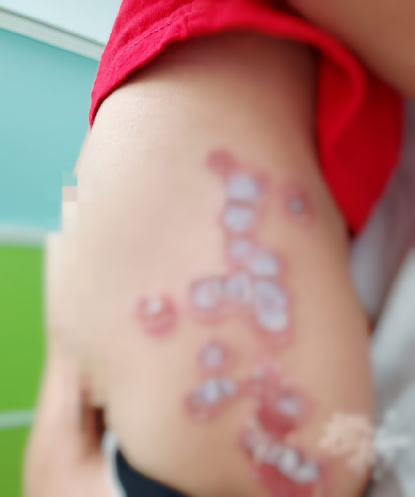 一個星期前,3歲的果果被家里人抱著來到了杭州市第一人民醫(yī)院兒童皮膚科。接診的市一醫(yī)院皮膚科副主任卜璋于主任醫(yī)師在掀開他的衣服后,看到了果果身上和腿上一顆顆碩大的紫紅色膿皰,這些膿皰密密麻麻地挨在一起,格外顯眼,還發(fā)著低燒。