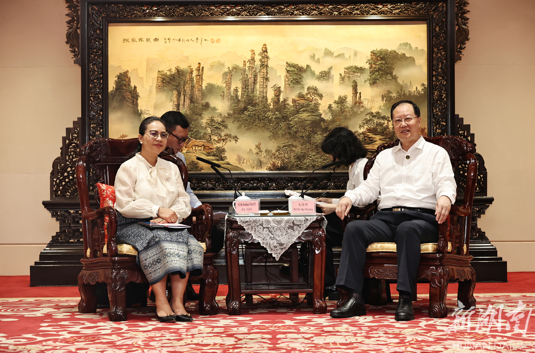 毛偉明對客人的到來表示歡迎,并簡要介紹湖南經濟社會特別是加快綠色低碳發(fā)展情況。他說,近年來,湖南深入貫徹習近平生態(tài)文明思想,全面踐行“綠水青山就是金山銀山”理念,協(xié)同推進降碳、減污、擴綠、增長,大力實施能源綠色低碳轉型、工業(yè)領域碳達峰等“碳達峰十大行動”,累計獲批國家級綠色工廠100家、綠色工業(yè)園區(qū)10家,高質量發(fā)展“含綠量”不斷增加,綠色發(fā)展指數(shù)進入全國前十。毛偉明說,湖南與老撾地緣相近、感情相依,在基礎設施建設、經貿、旅游等領域合作緊密。希望雙方以此次“綠博會”舉辦為契機,進一步密切高層交往,探索開展礦業(yè)開發(fā)、生態(tài)修復、災害防治等自然資源領域合作,加強水污染防治、大氣污染防治等生態(tài)環(huán)保協(xié)作,在融入共建“一帶一路”中加強生態(tài)文明互鑒、拓展綠色合作空間、增強綠色發(fā)展動力。