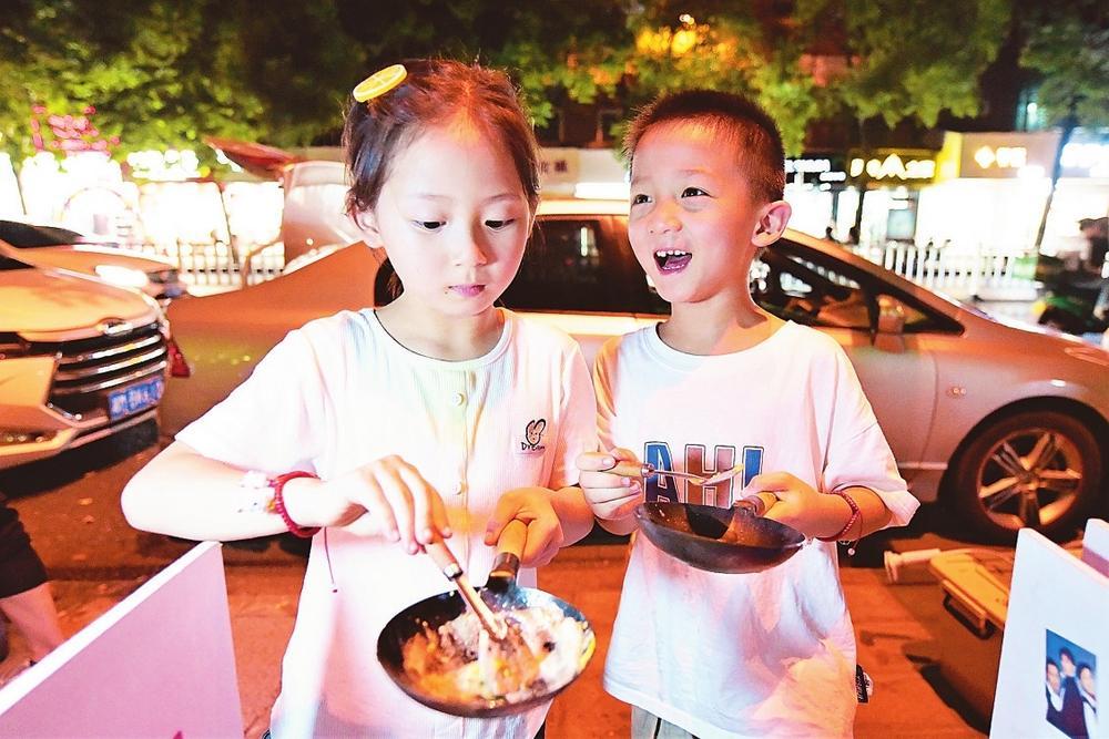 ▲六歲半的雙胞胎劉美劉滿在北湖公園使用迷你廚具體驗(yàn)炒菜