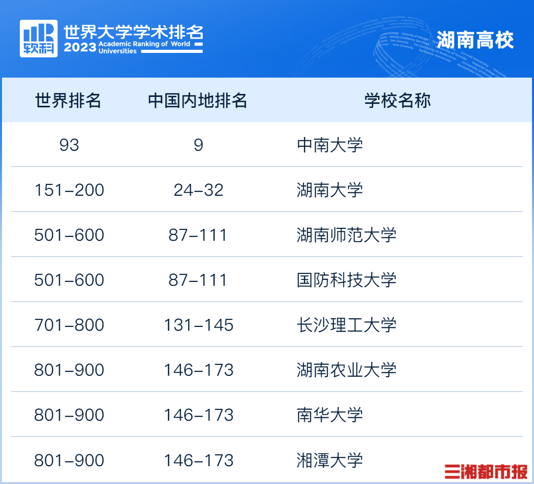 中南大學2023年世界排名第93,首次入圍全球百強!今日,高等教育評價機構軟科正式發(fā)布“2023軟科世界大學學術排名”。本次排名展示了全球領先的1000所研究型大學,中國內地共有191所大學上榜,10所位列世界百強,比去年增加2所。其中,湖南共有8所高校入圍全球前1000,上榜高校數(shù)位居全國第9。