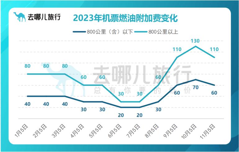 10月27日,去哪兒接到航空公司消息:自2023年11月5日(出票日期)起,成人旅客:800公里(含)以下航線每位旅客收取60元燃油附加費(fèi),800公里以上航線每位旅客收取110元燃油附加費(fèi)。相較于調(diào)整前分別降低了10元和20元。