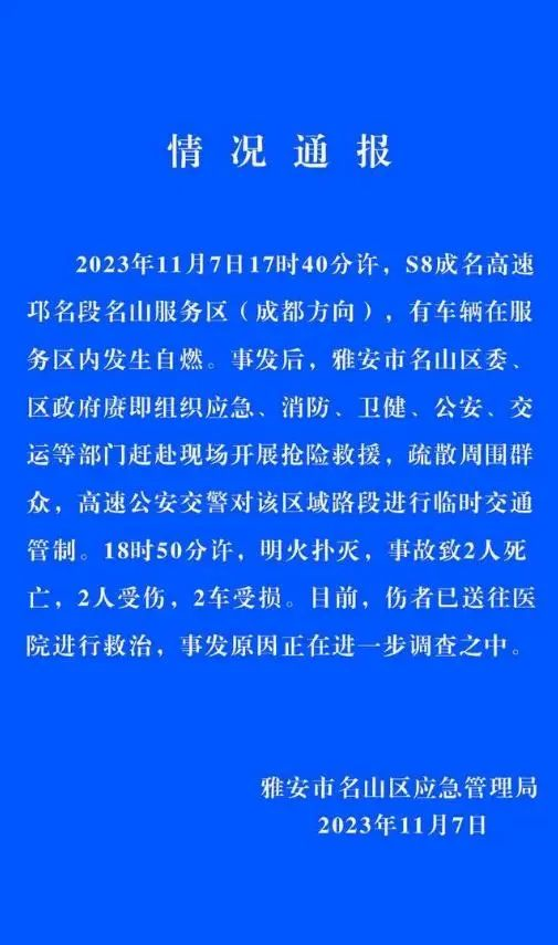 事發(fā)后,雅安市名山區(qū)委、區(qū)政府立即組織應(yīng)急、消防、衛(wèi)健、公安、交運(yùn)等部門趕赴現(xiàn)場(chǎng)開(kāi)展搶險(xiǎn)救援,疏散周圍群眾,高速公路交警對(duì)該區(qū)域路段進(jìn)行臨時(shí)交通管制。