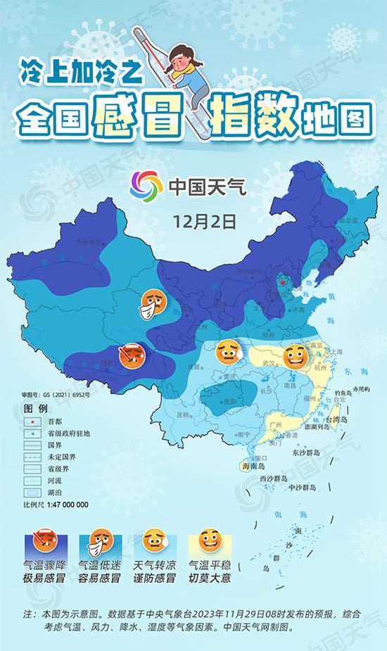 近期,我國多地呼吸道疾病進入高發(fā)期,流感、腺病毒、肺炎支原體等各種呼吸道病原體同時存在,醫(yī)院門急診量猛增。每年冬天都是感冒高發(fā)時節(jié),冷空氣影響下,一不小心感冒就會找上門來。今后三天(11月29日至12月1日),一股較強冷空氣將給我國大部帶來氣溫大跳水。中國天氣網(wǎng)特別推出全國感冒氣象指數(shù)地圖,提醒大家添衣保暖,別讓冷空氣鉆空子。
