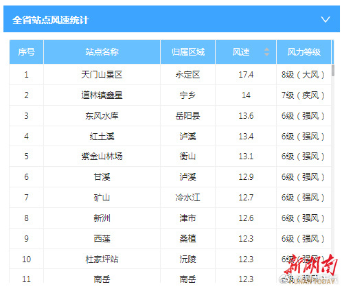 根據(jù)湖南省全部站點過去1小時極大風速風向?qū)崨r監(jiān)測顯示,30日8時至9時;省內(nèi)14個市州80個縣(市、區(qū))345站極大風速超過5級,其中1個市州1個縣(市、區(qū))1站極大風速超過8級,最大為永定區(qū)天門山景區(qū)站17.4米/秒(8級 ,30日8時36分),其次為寧鄉(xiāng)道林鎮(zhèn)鑫星站14.0米/秒(7級 ,30日8時45分)。