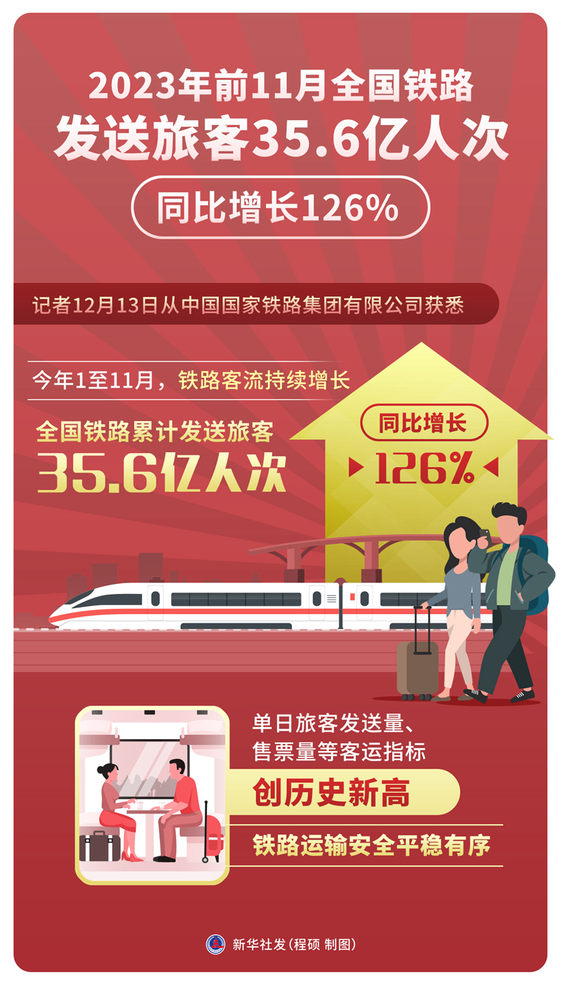 新華社北京12月13日電(記者樊曦)記者13日從中國(guó)國(guó)家鐵路集團(tuán)有限公司獲悉,今年1至11月,鐵路客流持續(xù)增長(zhǎng),全國(guó)鐵路累計(jì)發(fā)送旅客35.6億人次,同比增長(zhǎng)126%,單日旅客發(fā)送量、售票量等客運(yùn)指標(biāo)創(chuàng)歷史新高,鐵路運(yùn)輸安全平穩(wěn)有序。