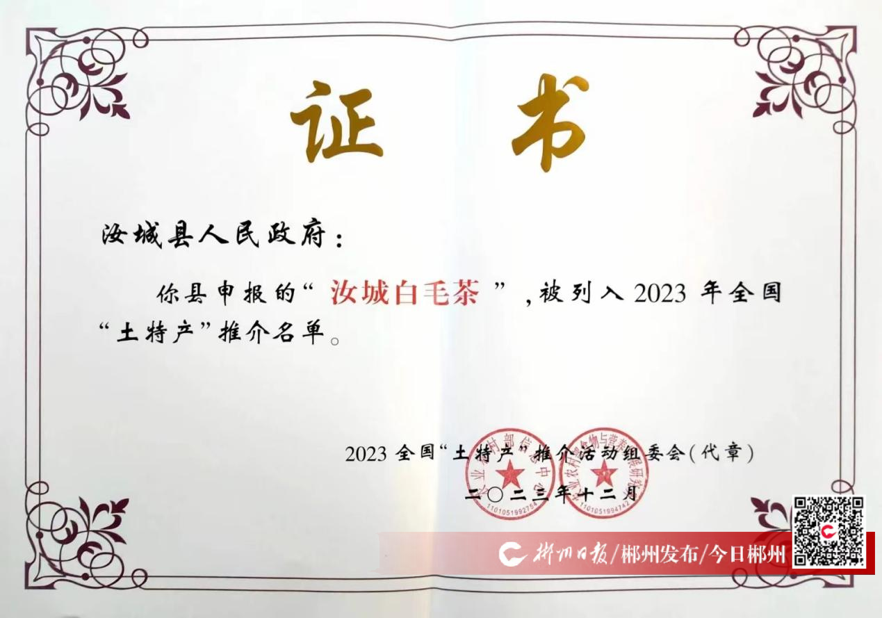 日出九龍江,天生白毛茶。綠水青山間孕育出的汝城白毛茶,原產(chǎn)于郴州市汝城縣九龍江原始次森林和三江口鎮(zhèn)蘭洞村一帶的山林中。這是汝城的驕傲,也是湖南的瑰寶。作為全國罕見珍稀的大葉多毛野生茶,其獨特之處在于色澤翠綠,茸毛特多,清香怡人。泡上一杯,茶葉在水中葉芽緊結,亭亭玉立,久泡不沉。聞之,茶香芳香自然,一口入喉,如同芭蕾舞者在舌尖起舞。早在明清時期就被列為貢品,被譽為“綠色仙丹,茶中明珠”,先后獲得湖南省名茶、“湘茶杯”金獎,巴黎國際名、優(yōu)、新博覽會最高金獎等榮譽,成功打入國內外市場。2016年和2021年,汝城白毛茶先后認證國家地理標志證明商標和農(nóng)產(chǎn)品地理標志登記產(chǎn)品。