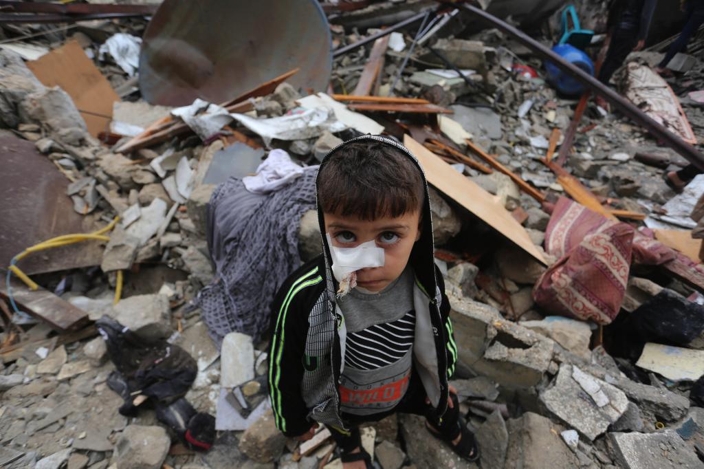 11月15日,在加沙地帶南部城市拉法,一名兒童站在遭以色列空襲后的建筑廢墟中。新華社發(fā)(哈立德·奧馬爾攝)