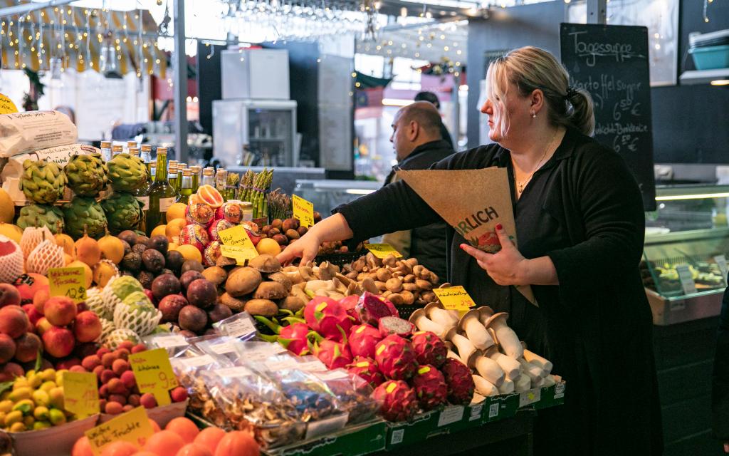 12月20日,在德國法蘭克?!靶∈袌龃髲d”,一名攤主為顧客挑選水果。新華社記者張帆攝