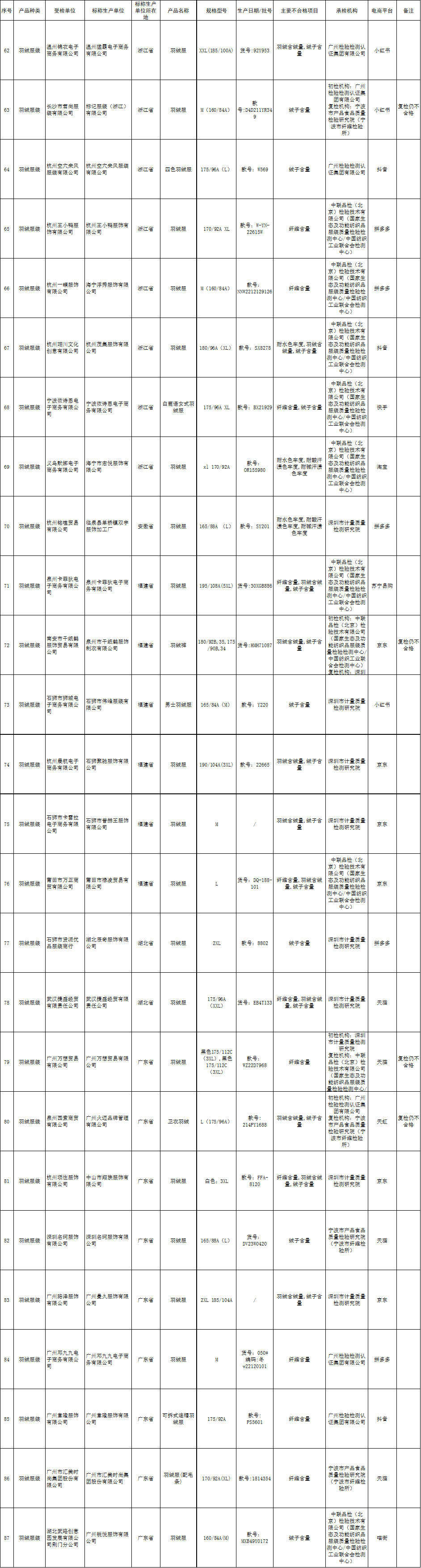 185批次羽絨服裝產(chǎn)品質(zhì)量