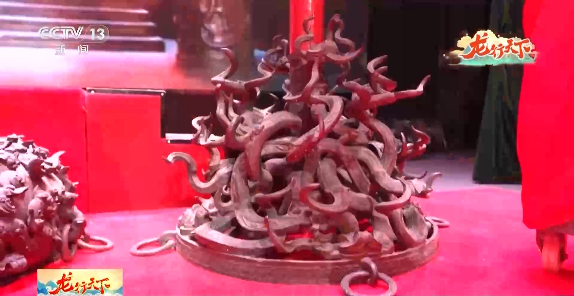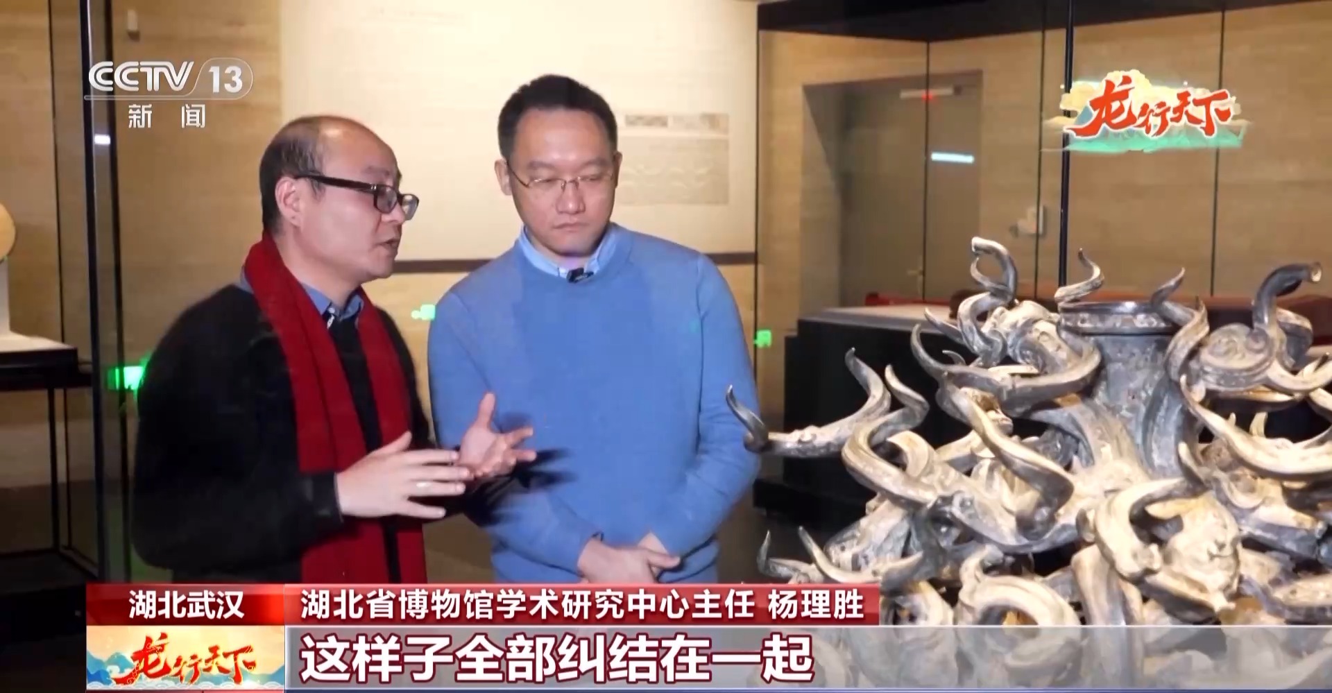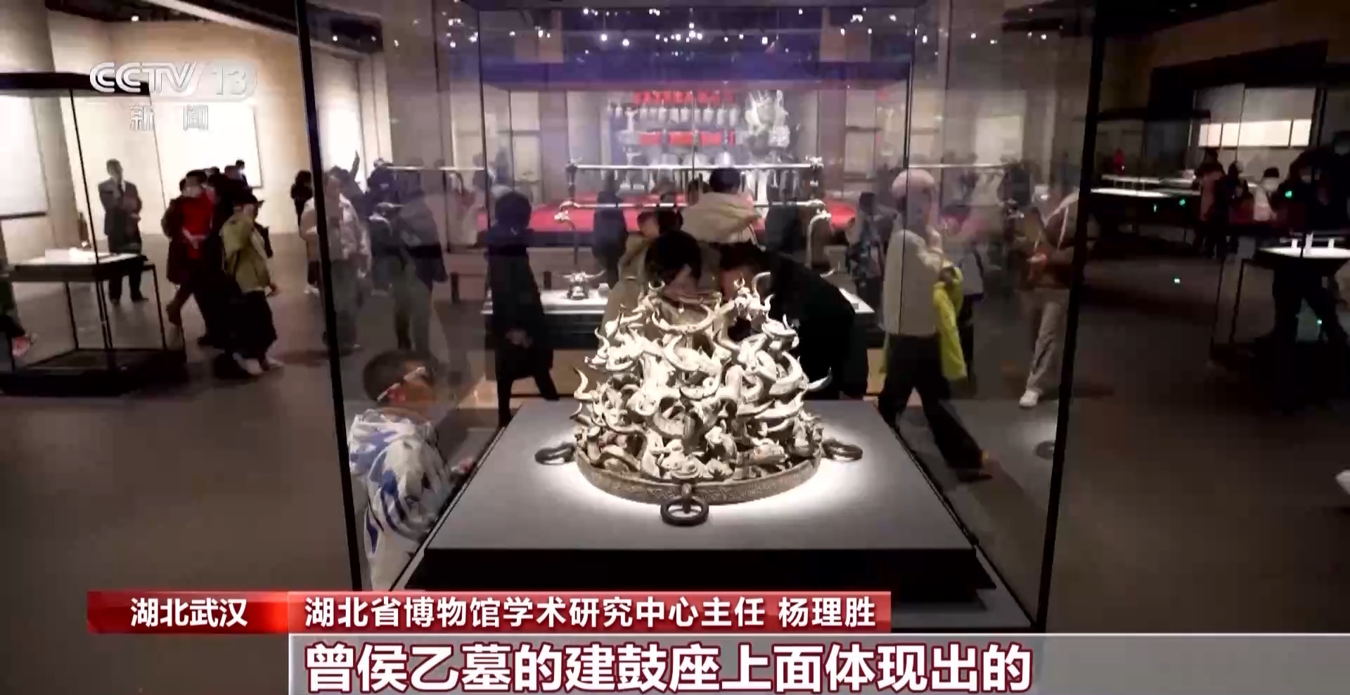 湖北省博物館學(xué)術(shù)研究中心主任 楊理勝:建鼓座其實(shí)從發(fā)掘報告的時候,它就沒有把龍有多少數(shù)量數(shù)清楚,只提到了它有八對主龍。其實(shí)在它的軀干上面,又會有一個龍長出來,龍上長龍,這樣子全部糾結(jié)在一起,不是特別好數(shù)。有外國游客過來,想把這個龍有多少條數(shù)清楚,數(shù)了很多遍,他的結(jié)論是108條,但是事實(shí)上換一個角度,可能就數(shù)的數(shù)又不一樣了,它是一件孤品。