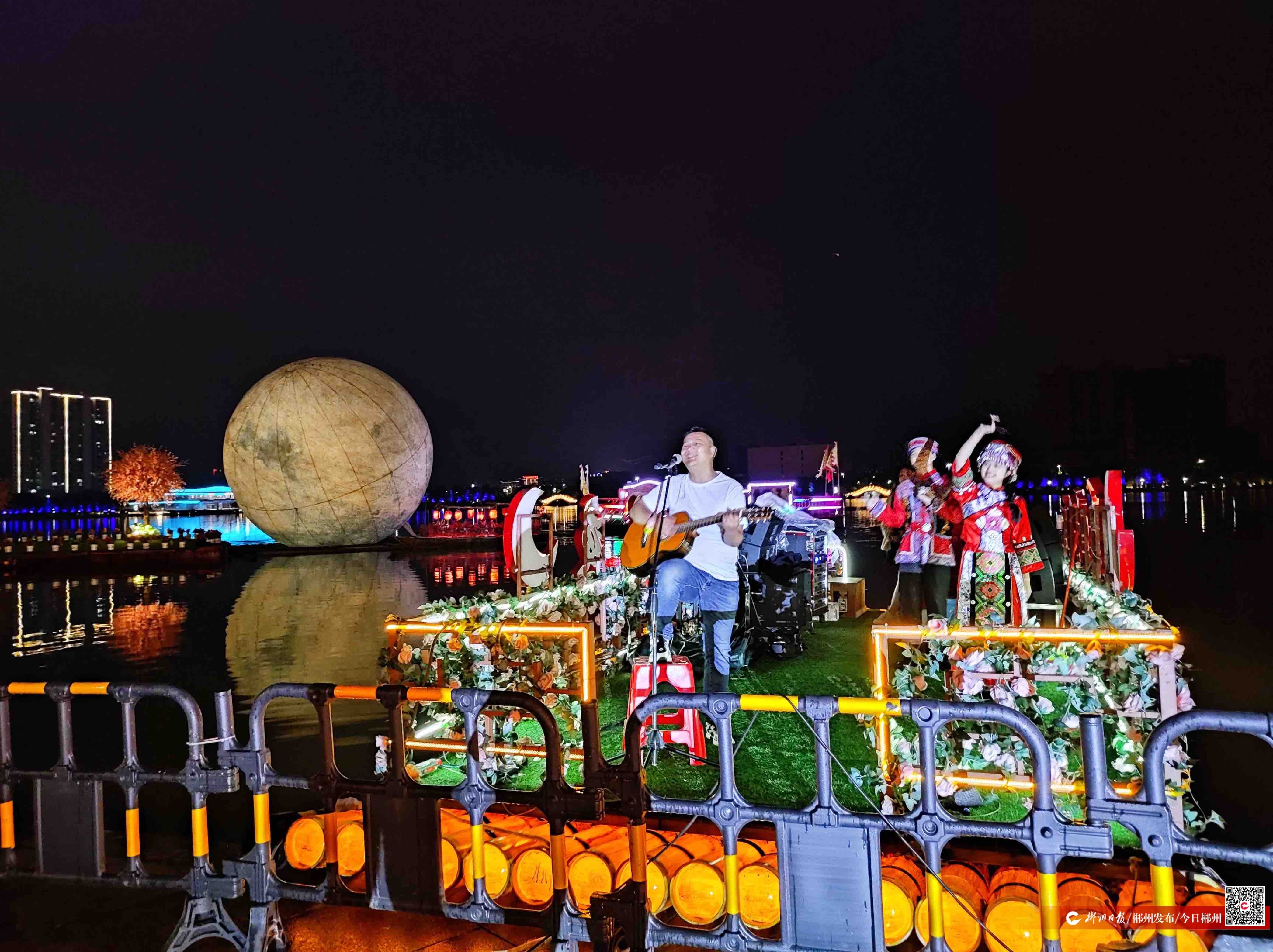 5月1日晚,資興市東江湖畔雅閣碼頭東江花月夜項(xiàng)目表演現(xiàn)場(chǎng)流光溢彩、微風(fēng)習(xí)習(xí)。在五彩斑斕的光影映照下,歌舞表演者黎佩雯一襲絢麗的瑤族服飾顯得越發(fā)光彩熠熠。音樂(lè)響起,她笑靨如花、翩翩起舞,柔美的身姿融入無(wú)盡的夜色中。