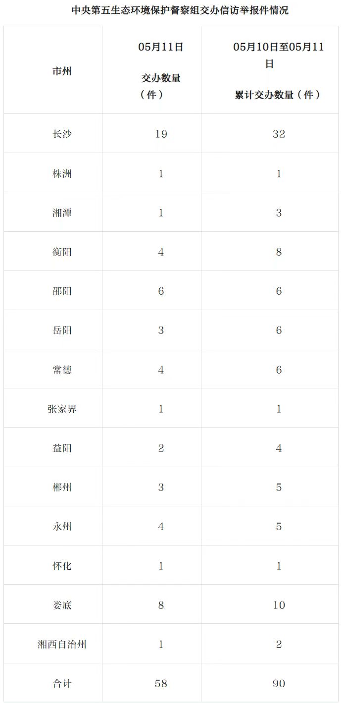 中央第五生態(tài)環(huán)境保護(hù)督察組今天向湖南交辦群眾信訪舉報(bào)件58件(來電舉報(bào)53件,來信舉報(bào)5件),其中重點(diǎn)件5件。
