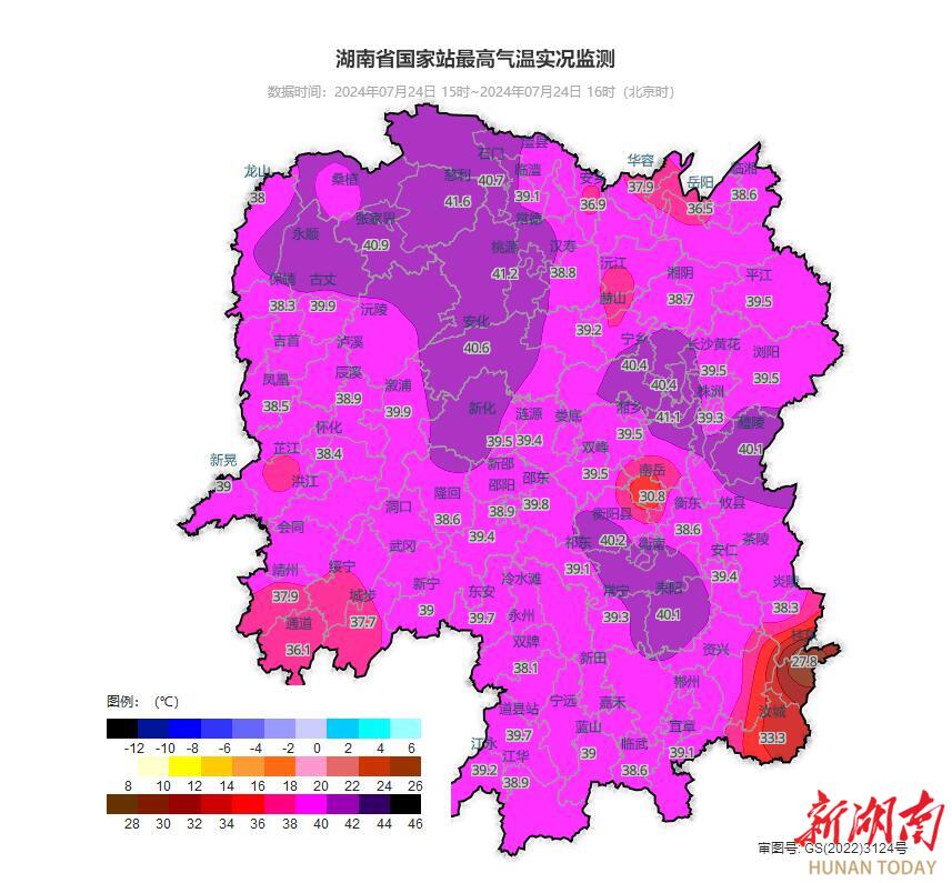 這幾天,湖南熱得十分“均勻”。據(jù)湖南省國家站最高氣溫實況監(jiān)測顯示,7月24日15時至16時,湖南大部氣溫在38至40℃之間,15個縣市區(qū)最高氣溫大于或等于40℃,40個縣市區(qū)最高氣溫大于或等于39℃,84個縣市區(qū)最高氣溫大于或等于38℃。