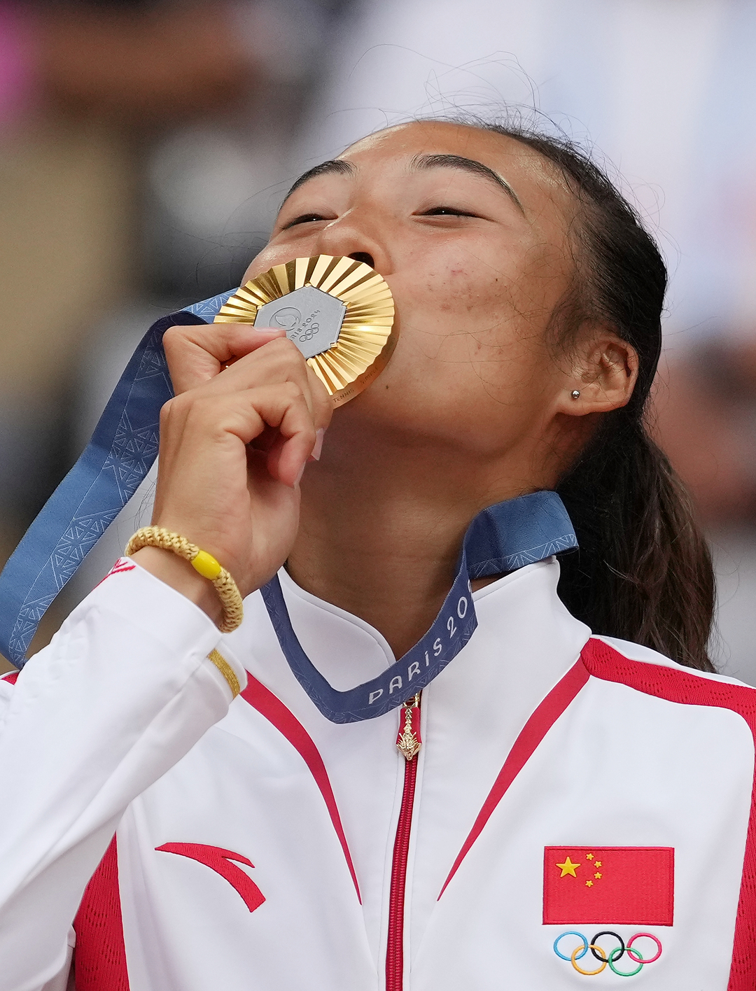 (8月3日,在巴黎奧運會網(wǎng)球女子單打決賽中,中國選手鄭欽文2比0戰(zhàn)勝克羅地亞選手維基奇,奪得金牌。 圖片來源:新華社)