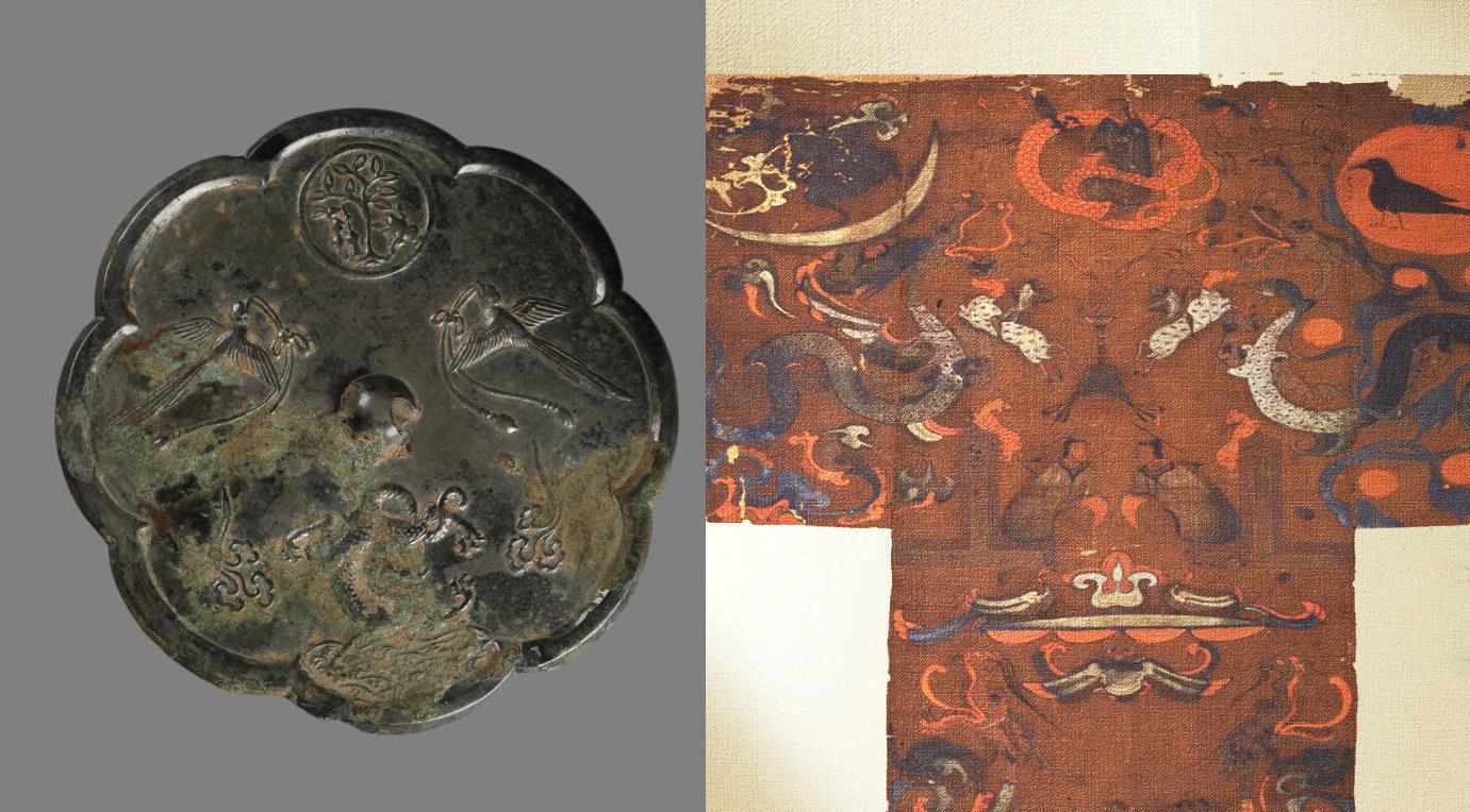 △陜西歷史博物館珍藏的雙鸞月宮紋葵花形鏡(左)和湖南博物院展出的馬王堆漢墓出土的T形帛畫(右)