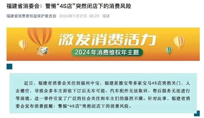 近日,針對福州中寶、福建星德寶等多家寶馬4S店突然關(guān)門,福建省消費(fèi)者委員會(下稱“消委會”)點(diǎn)名提醒,警惕4S店突然閉店消費(fèi)風(fēng)險。