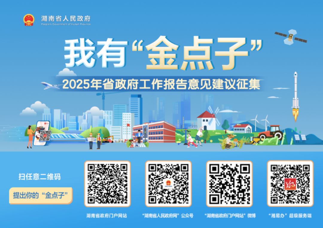 您對美好生活的向往,就是政府奮斗的目標(biāo)。11月29日起,湖南省政府門戶網(wǎng)站聯(lián)合多家媒體與各市州、省直部門政府網(wǎng)站和政務(wù)新媒體以及“湘易辦”超級服務(wù)端,開展“我有‘金點子’——2025年湖南省政府工作報告意見建議征集”活動,聽取網(wǎng)民對政府工作的意見建議,科學(xué)謀劃2025年省政府工作。即日起至2025年湖南省兩會召開前,網(wǎng)民可以通過活動專欄對政府工作建言獻策,一起為湖南高質(zhì)量發(fā)展描繪新藍(lán)圖。